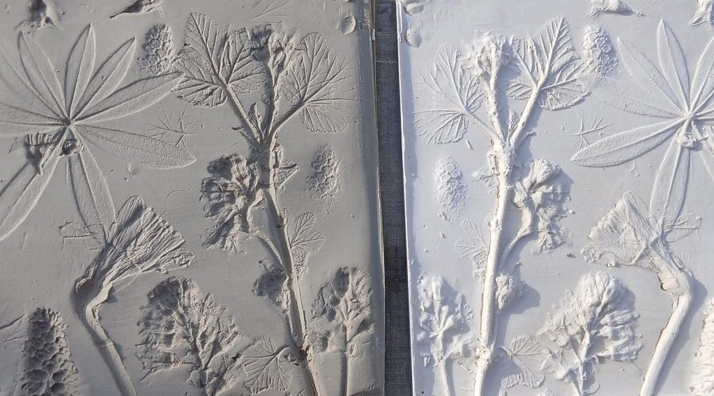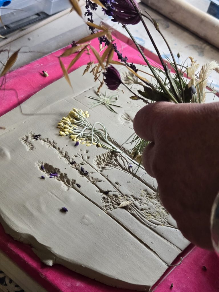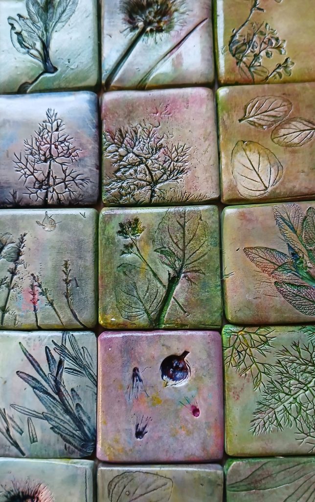 Mini landscapes are created by imprinting local botanicals, both fresh and dried, into earthenware clay, in my studio space at The Clay Studio. These are fired to 1000 degrees Celsius and then coloured.